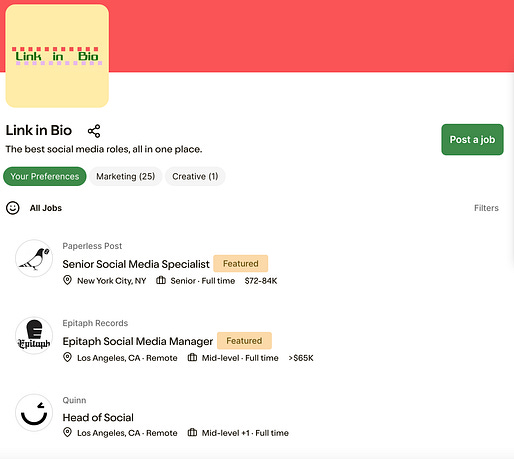 BR: FACEBOOK IS NOT DEAD, I REPEAT, FACEBOOK IS NOT DEAD. I can’t scream this enough!!! I mean, it makes sense. For both of my brands, Facebook is our biggest community—Jamba has 1.6M Facebook fans and Auntie Anne’s has 993K fans. We really wanted to wake them up and post content that they care about and engage with. This has created an impression engine that continues to grow and surprise us. RK: How would you describe your Facebook strategy currently? BR: We like to post fun, relatable, and shareable content. So many buzz words, but you get the gist. If you think about how people act on Facebook, they LOVE to comment, tag friends, and share on their own feed. We want to cater to that. We love to post just text-based status updates and mix in images from our Instagram feed. But the content that does the best is just basic status updates, especially asking questions and asking for opinions—like this and this. RK: Tell me more about some of the results you've seen! BR: In 2022, we saw 11M impressions and 340K engagements alone on Auntie Anne’s Facebook! RK: What advice would you give to a brand that has given up on Facebook? How do you get that audience re-engaged? BR: I think you just start posting. Whether you have a small community or a big one, I think you just start posting text-based statuses. You can honestly just copy and paste your tweets! In general, I think one of the only ways to be successful on social is to be consistent. If you want your community to show up for you, you have to show up for them. When you post consistently, you can start learning about your audience and tailor your content accordingly. RK: Tell me about a recent post (on Facebook or any other platform) that you are proud of! RK: Are you hopeful for the future of social media? BR: I am! I think change is inevitable and we will just roll with the punches. I haven’t run off of any platforms...yet. I think brands/companies are finally realizing how important organic social is and I think we are finally getting the recognition and resources we deserve 😊. BR: The beauty of social is that you can test and learn. That’s how I started all of this. I just posted because why not? It unlocked an entire strategy on a platform that’s been neglected for years. Now, I scream it from the rooftops to post on your brands Facebook pages. If you’re a paid Link in Bio subscriber, Bari will be answering all of your questions in the Discord today! Get in there and ask away. Speaking of, in this week’s Logged On send for paid subscribers I talked about why organic social isn’t dead—you just need to post more shareable content. Heard from multiple people that this one was super helpful, which is feedback I always love to receive!!! Ready to find your next role? Join the Link in Bio Talent Collective and check out the job board with awesome roles from Epitaph Records, Paperless Post, Adobe, and more! As a reminder, the Link in Bio Talent Collective is a way for companies to find talented social pros—and for you to find your next role. If you’re open for work (or are even very casually looking for new opportunities), you can apply here. Once accepted, your profile will get put in front of companies who are looking to hire social media positions. And if you work at a company looking to hire talented social media professionals, you can head here to get access to the Link in Bio Talent Collective. |