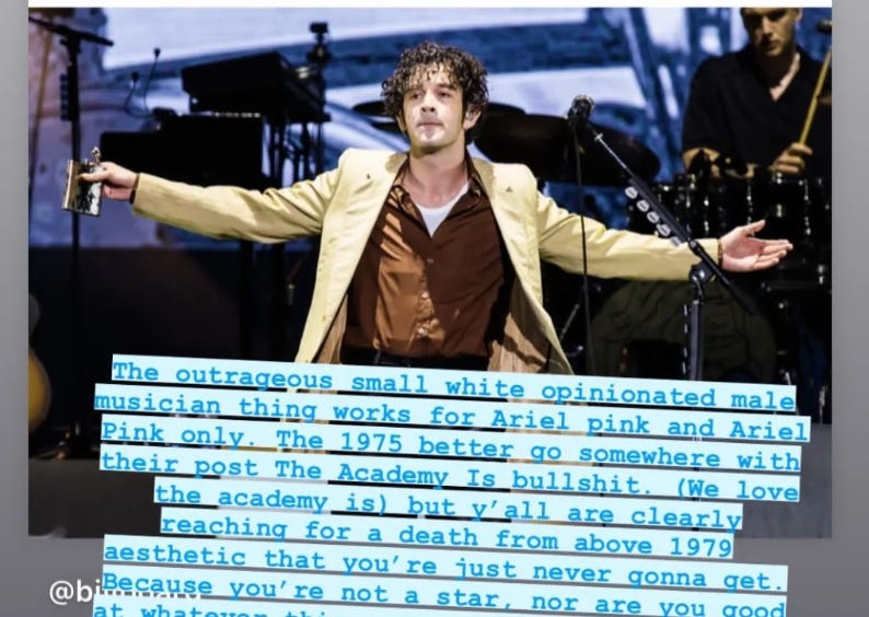 Welcome to the free version of Garbage Day. Think about subscribing. A subscription goes a long way and it means I get to keep bringing you new internet garbage every week. And if subscriptions aren't your thing, hit up the merch store or shoot me an email about a sponsoring an issue with an ad. Matt Healy Can’t Escape The Millennial SimulacrumAlright, let’s catch you up: The 1975 lead singer Matt Healy went on The Adam Friedland Show back in February, which is a podcast that used to be called Cum Town and also used to be sort of connected to the greater dirtbag leftist cinematic universe, namely the much-bigger Red Scare podcast. The 1975’s fans, most of them teenage girls, freaked out because, while on the show, Healy acted like a huge racist edgelord, laughing along to an offensive bit about the rapper Ice Spice. Then, earlier this month, rumors circulated that Healy was dating Taylor Swift. The two have been in each other’s orbit since the early 2010s. Once it became clear that the two are actually dating, Swifties also had a huge meltdown. Which has led to a lot of deeply neurotic posting from Swift fans who, apparently, up until now, believed that stanning Taylor Swift was activism of some kind. Then, last week, Swift debuted a (bad) remix of her song “Karma,” featuring Ice Spice and also brought the rapper out on stage during an Eras tour date to perform it over the weekend. I guess Swift and her team thought this would be a good way to address-without-addressing Healy’s TAFS clip controversy, but it actually just made things much worse. The most recent salvo in this whole drama was a Healy New Yorker profile titled, “Who Is Matty Healy?” The feature was written by the always-good Jia Tolentino. It chronicles Healy’s fixations on the reality-warping effects of mass and digital media, his contradictory feelings about masculinity and mental health, his history of drug use, the impact of growing up the child of working class parents who were also famous (his mom was on Eastenders), and his yearning for The 1975 to, as a band, mean something more than they currently do. Which is all great and good, except Healy has literally been saying this stuff for almost a decade. In fact, this isn’t even the first time he’s talked about this stuff with the New Yorker. Luckily for you, and unfortunately for me, I’ve read almost every interview this guy has given since at least 2015 and I can tell you that all of them are about how he stopped using heroin, started using social media and irony too much to cope, got burned out on all of it, and is now pledging to finally grow up. He also wants to “deconstruct” the idea of a “rock band”. Oh, and, of course, there is always an undercurrent of seething resentment towards the band’s fanbase of young girls. In the New Yorker interview, Healy refused to really apologize for anything he’s said or done recently, believing that anyone who was offended by the TAFS interview is “a bit mental”. And so, I’ll give the final word on all of this to rapper Azealia Banks, who, on Instagram, said that The 1975 makes music for “fat emo teenagers” and called Healy a “small white opinionated male musician.” But Healy isn’t the only creator of his generation that seems to be pathologically unable to take the risks required to make the art and be the artist they think they are while using social media to LARP as if they have. I was struck by the similarities between Healy and infamous Instagram grifter, Caroline Calloway, who got her own big profile this week, in Vanity Fair. If you haven’t checked in on Calloway in a while, she was chased out of New York after not paying rent for months while trying to ingratiate herself with Manhattan’s “post-woke” (hipster fascist) Downtown Scene during the pandemic, is now living in a retirement home in Florida, and is maybe, possibly, self-publishing a trio of books. Though, with Calloway, just like Healy, the online performance of creating always takes precedence over the actual creations. The similarities don’t end there, however. Both Healy and Calloway exist in bizarre gray spaces when it comes to their country’s respective class hierarchies and had childhoods in the proximity of the entertainment industry (Calloway briefly acted as a kid). Both tried making slick, algorithmically-friendly content before it apparently broke their brains. For Healy, it was Spotify-optimized indie pop, for Calloway, it was larger-than-life Instagram captions about going to school at Cambridge. And then both got addicted to drugs and became obsessed with impressing the same edgelord podcasters. Calloway went on Red Scare back in 2019 and it was an extraordinarily painful experience to listen to. There’s also the weird fact that after flirting with that scene and either failing to break into it or realizing it wasn’t worth the energy (or the Republican dark money ran out), both are now trying to align themselves with a different, more market-friendly neoliberal artist crowd. Healy is dating Swift, of course, but the most recent The 1975 album was produced by the king of brand safe nothingness, Jack Antonoff. Meanwhile, Calloway’s life rights were briefly owned by Antonoff’s ex and Swift “squad” member, filmmaker Lena Dunham, and Calloway, in her Vanity Fair interview, explicitly promised a Dunham-related book dedication that will be “a minor news story” if/when it happens. Oh, also, both are constantly defined by their relationship to a much more establishment-friendly artist. For Healy, it’s Harry Styles, for Calloway, it’s her alleged former-ghostwriter, Natalie Beach, who has actually managed to publish a book. It’s enough to make you wonder if maybe the defining millennial experience is actually just a deep longing to make things that matter, the crippling anxiety about what that might actually require — earnestness, introspection, material risk — and the de