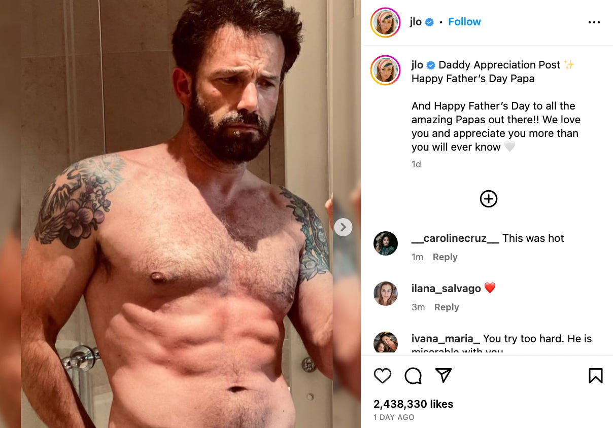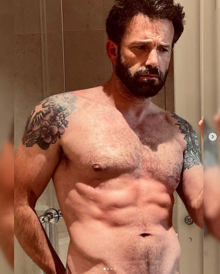 Thank you for being a free subscriber to Hung Up! This is a preview of what the paid list gets every Tuesday night. Many people celebrated Father’s Day on Sunday; Bennifer celebrated Ben Affleck’s Abs Day. Jennifer Lopez rang in the day with a four post carousel, led, of course, by a thirst trap: “Daddy Appreciation Post,” she captioned. “Happy Father’s Day Papa.” The only correct way to talk about this is slide by slide: Exhibit A: Devoted Hung Up readers will recall that there are two ways to be a Leo: the J.Lo way, which is over the top, in every way, always, and the Ben Affleck way, which is seemingly low key but actually subtly very high key. (Maybe there is a third way, promulgated by Leos me and DiCaprio, which is ... Keep reading with a 7-day free trialSubscribe to Hung Up to keep reading this post and get 7 days of free access to the full post archives. A subscription gets you: