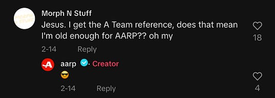 Thanks for reading Link in Bio! This is a free post. For subscription details, see my About page or your account page. You can reply to this email. The most convincing proof that TikTok isn’t just for Gen Z? Take a look at AARP’s delightful account. The organization, which is dedicated to empowering Americans 50 and older, regularly gets over 1M views on videos and has a dedicated Gen X following.