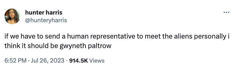 Thank you for being a free subscriber to Hung Up! This is a preview of what the paid list gets every Tuesday night. Literal alien superstar: this week, a former Air Force intelligence officer has confirmed that aliens are real. On Wednesday, retired Maj. David Grusch testified to a House Oversight subcommittee that the government has been aware of “nonhuman” space activity since the 1930s, the AP reported. Aliens? Real? Katy Cats knew! Beyond any larger ramifications of this news, I can only think of the immediate question: If we have to choose someone to meet the aliens, like if there’s a need for one single emissary from earth to meet the aliens, to bravely go where no one has gone before who should it be? Gwyneth Paltrow, of course. In my vast experience of falling asleep during every space movie I have ever watched (with the exception of Alien, thank you Yaphet Kotto) and my extensive history of loving the Katy Perry song “ET” for all of its 13 years, I can wholeheartedly and confidently offer this reasoning: I think it would be funny. Keep reading with a 7-day free trialSubscribe to Hung Up to keep reading this post and get 7 days of free access to the full post archives. A subscription gets you: