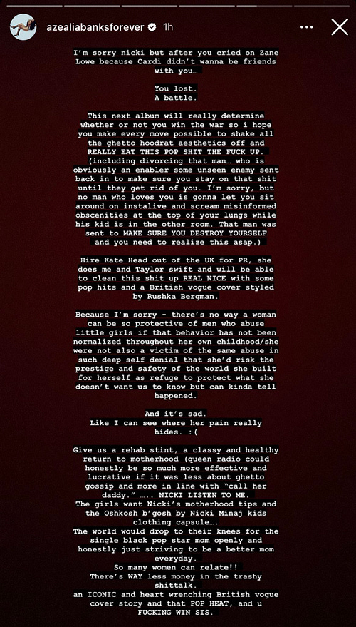 Thank you for reading Hung Up! If you share on social, please add a link :) In the Substack app for you this week: an ongoing Barbie chat. A bonus newsletter for the paid list, since I was on vacation last week: “Gwyneth Should Meet The Aliens.”Azealia Banks, devoted Hung Up readers will recall, is always either radically right or radically wrong. There is no in between, no middle ground, no kinda-sorta. Her faucet of truth never runs just lukewarm. Don’t let her eye of Sauron touch you — she read Matty Healy so thoroughly that even Taylor Swift recognized he had to be dumped pronto. This week Banks turned her attention to her fellow LaGuardia High School album Nicki Minaj. (“In the name of LaGuardia,” Banks even demands, and fellow barb and LaGuardia alum Timothée Chalamet’s ears perked up.) What exactly is the going on with House Minaj these days? The Queen’s career is in a state of disrepair: Minaj contributed an okay collab with Ice Spice to the Barbie soundtrack. Her followup to 2018’s Queen is slated for release in October. A documentary (that appears to have been dropped by HBO/HBO Max) is permanently forthcoming. There’s also the carousel of beefs with women rappers she likes until she decides they haven’t been appropriately adoring (Cardi B, Meg, Yung Miami, Latto, Ice Spice next), when she went anti-vax based on “evidence” from her cousin’s friends testicles’ HIPAA violation, and lest we forget the registered sex offender husband who is always on the verge of house arrest. But Minaj is still the reigning rapper, in my mind, male or female. In a rousing series of Instagram slides, Banks took Minaj to task: “[The Barbie song] really was Nicki’s moment. But sis really doesn’t understand that she’s gonna have to continuously be forced to acknowledge new rap girls and be used as a marketing pawn until she separates fully from any and all associations/relations with sex offenders,” Banks said. “Like she’s gonna spend the rest of her career doing lame collabs and having trash beef because of the sex offender shit. For someone seemingly so smart you think this would be obvious.” It’s a convincing piece of industry analysis and star management; this is more tough love than shade. Minaj is one of Banks’s favorite subjects, and she truly seems to want to see Nicki win. “This next album will really determine whether or not you win the war so I hope you make every move possible to share all the ghetto hood rat aesthetics off and REALLY EAT THIS POP SHIT THE FUCK UP,” she continued. And then, a truly stellar parenthetical: “(Including divorcing that man … who is obviously an enabler some unseen enemy sent back in to make sure you stay on that shit until they get rid of you. I’m sorry but no man who loves you is gonna let you sit around on instalive and screamed misinformed obscenities at the top of your lungs while his kid is in the other room. That man was sent to MAKE SURE YOU DESTROY YOURSELF and you need to realize this asap.)” “You won't find reasonable men on the tops of tall mountains,” Hunter S. Thompson once wrote. The line crossed my mind recently when I was one hour into a strenuous two hour hike I was told was just “a nice hike to lunch.” Hunter Harris says: “You won’t find reasonable Barbz,” and the sentence just ends there, meaning that is the complete thought. And yet! Azealia Banks, when she’s right, is always very right. Due Diligence Add the Emmys to the list of casualties of the AMPTP’s refusal to give members of the WGA and SAG-AFTRA a fair contract already. (Variety) I will never not be nosy about the friendship breakup between Selena Gomez and her friend/organ donor, the actress Francia Raisa. (Raisa gave Gomez one of her kidneys in 2017. She unfollowed Gomez in November, after Selena told Rolling Stone that Taylor Swift was her only friend in Hollywood.) This week, Raisa deflected TMZ’s questions about this Instagram posted by Selener: Some personal news: I have started watching RHONY. Lilly Jay Will Not Go Gentle Into That Good Night Some version of a timeline: Ariana and Gomez married in May 2021. In December 2022, Grande began shooting the (inexplicably, two) film adaptations of Wicked in London. By January 2023, according to TMZ, Grande and Gomez had separated. (Gomez has tried to launch something of a media blitz of his own, getting the word out to People that he is “very religious” and was “committed to making it work.”) When TMZ reported that Grande and Slater were dating, the site timed the relationship as starting “several months ago.” Sometime during the production of Wicked, presumably before Grade and Slater started dating, the “break up with your girlfriend, i’m bored” singer hung out with Slater, his now-estranged wife Lilly Jay, and their infant. But in a radical return to the celebrity antics of Julia Roberts’ A Low Vera t-shirt and Billy Crudup leaving (seven months pregnant) Mary-Louise Parker for (24-year-old) Claire Danes, Lilly Jay is not going quietly. While Slater files for divorce, Jay appeals to the court of public opinion, spoke candidly to Page Six and the Daily Mail. “[Ariana’s] the story really. Not a girl’s girl. My family is just collateral damage,” she told Page Six. (Not a girl’s girl is very 2014 white feminist to me, but I appreciate her candor.) To the Daily Mail: “I am focused on rebuilding a life for our son. This is what I am trying to do and this is my only focus.” Mind you, all this fussing is over this man: https://twitter.com/ethansaslater/status/1244474814410174467 Yeah you just have to click. That is the man at the center of a stan war … Broadway’s own SpongeBob SquarePants. The real winner in all of this is Cynthia Erivo, who no longer has the most chaotic relationship history of the Wicked cast. Speaking of Divorced Men That little triangle tattoo … there is something so $52,000 a year liberal arts sch
