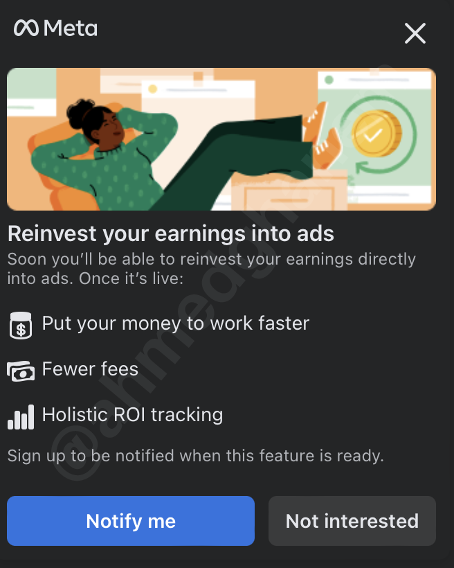 #NEW #Meta will soon allow you to reinvest your earnings directly into ads |  | | | Jul 11, 2023 | | |  | | | 16 Likes 5 Retweets 0 Replies |