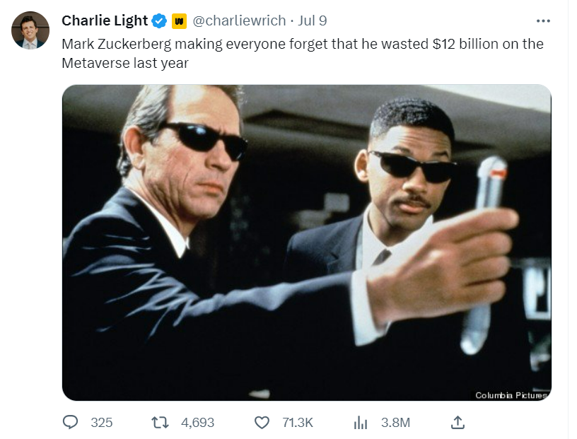 Twitter Starts Sharing Ad Revenue With Creators [SHOW ME THE MONEY] Threads Engagement Dips But Threat to Twitter Still Real [UNDER PRESSURE] Twitter Blocks Threads Links Amidst Reports of Traffic Drop [TH-RED ALERT] Twitter Backtrack on Removal of Old TweetDeck [IT’S BACK!] Meta Exec Says “Metaverse Hype is Dead” And He Is Happy [OVERHYPED]