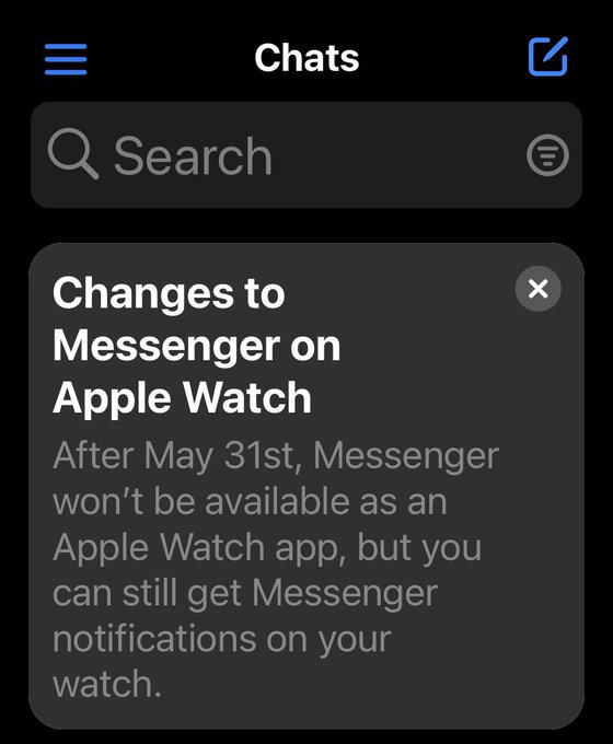 Facebook discontinuing Messenger app for Apple Watch on May 31 https://t.co/2L2KvpBp9T https://t.co/Afanm1a89M |  | | | May 11, 2023 | | |  | | | 3 Likes 4 Retweets 0 Replies |