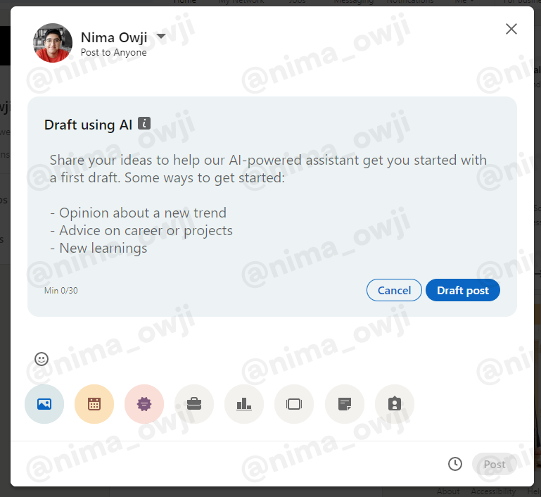 BREAKING: #LinkedIn is working on an AI-powered assistant that get you started with a first draft for your next post! https://t.co/sl5Fl4pt2l |  | | | May 5, 2023 | | |  | | | 49 Likes 15 Retweets 7 Replies |